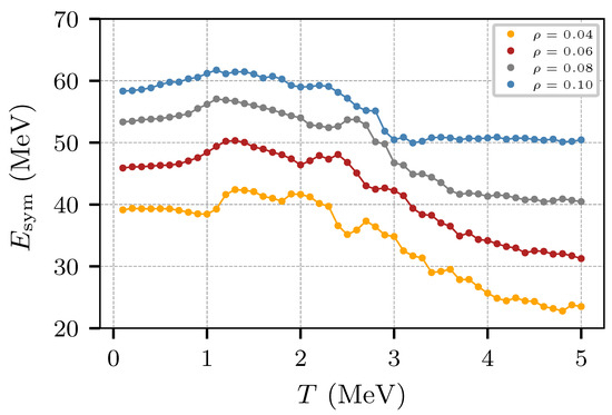 Following the procedure of [31,44,64] (cf. Appendix B), one can compute the symmetry energy both of nuclear matter and of neutron star matter. Figure 20 shows the variation of with the temperature for four sub-saturation densities.