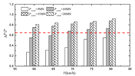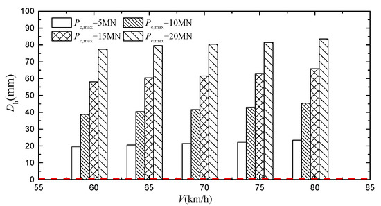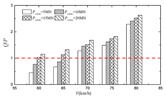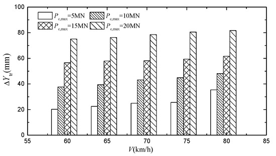 | V (km/h) | Pc,max (MN) | ΔZ (mm) | Derailment Wagon and Wheel | Q/P | ΔP/P | Bh (mm) | Dh (mm) | ΔYtr (mm) | ΔYtr/1.25 (mm) |