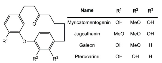 - Salih, M.Q.; Beaudry, C.M. Chirality in Diarylether Heptanoids: Synthesis of Myricatomentogenin, Jugcathanin and Congeners. Org. Lett. 2012, 14, 4026–4029. [Google Scholar] [CrossRef] [PubMed]