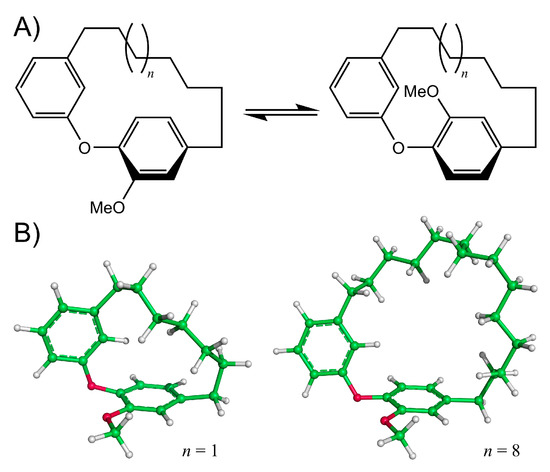 Diarylether heptanoids such as myricatomentogenin, jugcathanin, galeon, and pterocarine (Figure 1) are examples of chiral, naturally occurring, asymmetric plant metabolites with biological properties of medicinal interest (hepatoprotective activity, anti-androgenic activity, inhibition of nitric oxide production, anti-inflammatory activity, and anti-tumor activity) [8,9,10]. The atropisomerism of these compounds arises from the hindered rotation of the para-substituted diarylether ring sterically clashing with an intramolecular tether (or “rope”). The seven-carbon tether is short enough to restrict the “rope-skipping” isomerization (Figure 2A) of the molecules, but longer lengths may be expected to permit racemization (Figure 2B) [11]. Collectively, the unique structure and biological activities of these diarylethyl heptanoids open questions into the length of the tether required to maintain isolatable enantiomers of tethered diarylethers along with the effect the tether may have on molecular binding to biological targets. To date, no systematic investigation of the relationship between tether length and barrier to racemization in diarylether cyclophanes has been reported.