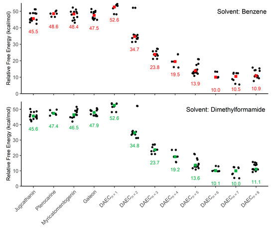 Plots of relative activation energies for isomerization between enantiomeric conformations within an implicit solvent of benzene and dimethylformamide. Colored squares are used to indicate the median activation energy (also listed) for each sample of molecule conformations.