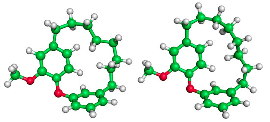 - Pattawong, O.; Salih, M.Q.; Rosson, N.T.; Beaudry, C.M.; Cheong, P.H.-Y. The nature of persistent conformational chirality, racemization mechanisms, and predictions in diarylether heptanoid cyclophane natural products. Org. Biomol. Chem. 2014, 12, 3303–3309. [Google Scholar] [CrossRef]