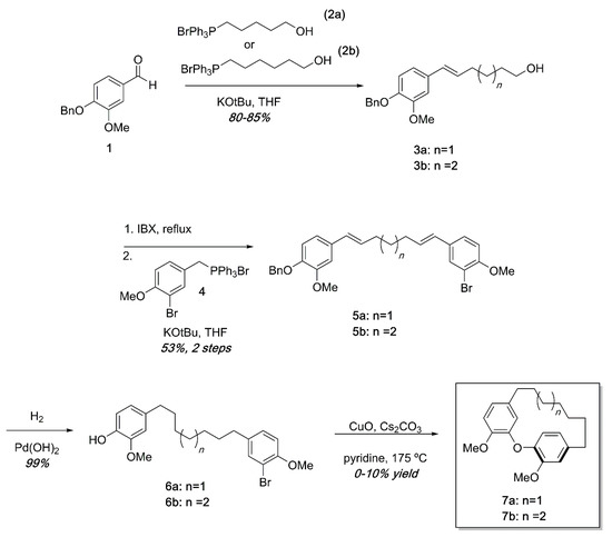 Ullmann substrates were prepared containing varying tether lengths using successive Wittig reactions as shown in Scheme 1. Beginning with commercially available 1 and the known Wittig reagents 2a and 2b [26], styrenes 3a and 3b could easily be accessed in high yields. Oxidation of the primary alcohol [27] and a second Wittig reaction with the known Wittig salt 4 led to dienes 5 in modest yields. Hydrogenation of 5a or 5b proceeded quantitatively to deliver the Ullmann substrates 6a and 6b. Ullmann coupling was attempted using various conditions including using K2CO3 or Cs2CO3 as base, temperatures from 130–210 °C, and Pd(OAc)2 catalysis [28]. After extensive reaction optimization, we found that the cyclization occurred in 0–10% yields in pyridine using CuO as a catalyst and Cs2CO3 as a base in a sealed tube at 175 °C. To avoid intermolecular Ullmann coupling, each reaction required high dilutions (0.005 M or less). In previous synthetic efforts, similar Ullman couplings with low yields are not unprecedented [24]. An additional frustration was that the high heat required for the reactions led to complex mixtures that were difficult to separate by chromatography. The combination of high dilution, low yields, and complex reaction mixtures made isolation of reasonable quantities of diarylether cyclophanes unsustainable by this synthetic pathway.