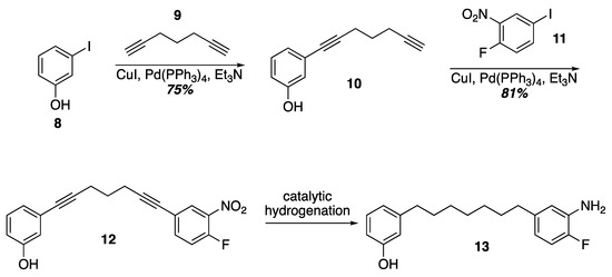 Prior work on the synthesis of the acerogenins showed that a final SNAr of a phenol on to an ortho-fluroronitro arene as the key cyclophane forming step could be executed at higher concentrations (0.1–1 M) and at room temperature. Given that terminal diynes from five to eleven carbons are commercially available as well as iodides 8 and 11, one idea to quickly construct SNAr substrates of various tether lengths would be to employ successive Sonogashira couplings followed by hydrogenation of the alkynes (Scheme 2). In fact, Sonogashira coupling of 3-iodophenol and 1,6-heptadiyne was uneventful leading to the terminal alkyne 10. Another Sonogashira coupling with commercially available 11 led to 12. Unfortunately, selective reduction of the alkynes in the presence of the nitro group with Wilkinson’s catalyst [29] led to indiscriminate reduction and attempts to re-oxidize the aniline back to a nitro group with MCPBA gave complex mixtures from which the target was not isolated [30]. Current efforts are underway to identify a viable route to these SNAr substrates that would allow varying tether lengths.