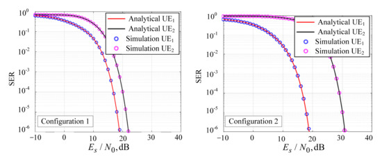 The validation of the expressions using simulation is provided in Section 5. The SER and BER values obtained from the simulation are compared with the calculated analytical values. In order to make a reliable comparison, we have used four various PD-NOMA configurations. The following conclusions can be made on the basis of the obtained results, and their analysis: