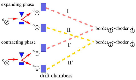 It changes the picture of measurements. Consider a generic Stern-Gerlach experiment shown in Figure 2 separately showing the wave function and the complex conjugate side. They are split in an inhomogeneous magnetic field and then enter drift chambers, where witnesses connected to the border state at fix a choice observable by charge coupled electronics. The setup of the initial particle to a spin ⊗ is common to both outcomes, ↑ and ↓, and can be ignored on both sides. The spin ↑-component and its future on both sides, the wave function and the conjugate one, following the dotted red line is then given in Equation (5):