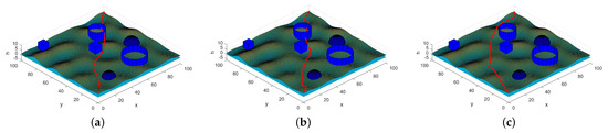 Optimal trajectory under different weights. (a) = (0.5,0.1,0.1,0.1,0.1,0.1), which means the decision-maker hopes that the fuel consumption is as low as possible. (b) = (0.1,0.1,0.5,0.1,0.1,0.1), which means the decision-maker hopes that the trajectory is more concealed. (c) = (0.1,0.1,0.1,0.1,0.5,0.1), which means the decision-maker hopes that the threat degree is as low as possible.