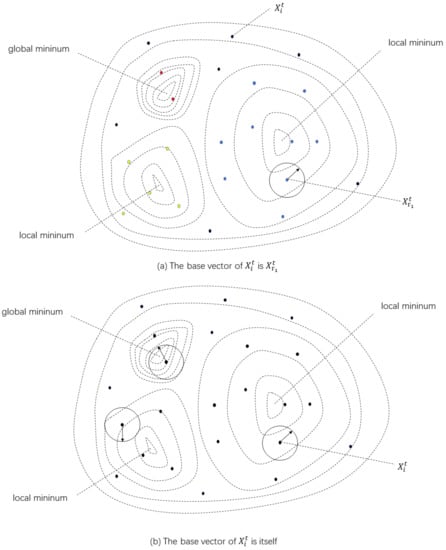 Numerous mutation strategies have appeared since DE was proposed, most derived from , , and []. As can be seen from Equations (1), (2) and (5), these three strategies all use a difference vector to provide disturbance, and differ in the way the base vector is chosen. Among the three mutation strategies, is usually thought to have the fastest convergence speed and best search performance for simple unimodal problems. However, its population diversity and exploration ability may deteriorate and even be completely lost in very few iterations, leading to stagnation or premature convergence. Different from , is more inclined to balance global exploration and local exploitation, but it has poor robustness. has a strong global search capability and is effective for complex multimodal problems. However, as shown in Figure 1a, although the population is relatively evenly distributed in the solution space (vectors of different colors represent different optimal regions), the local optimal region is relatively large compared with the global optimal region. Hence, has a high probability of choosing a blue or yellow vector as the base vector . This trend will be exacerbated as the iteration progresses. Therefore, the whole population has a high probability of falling into a local optimum.