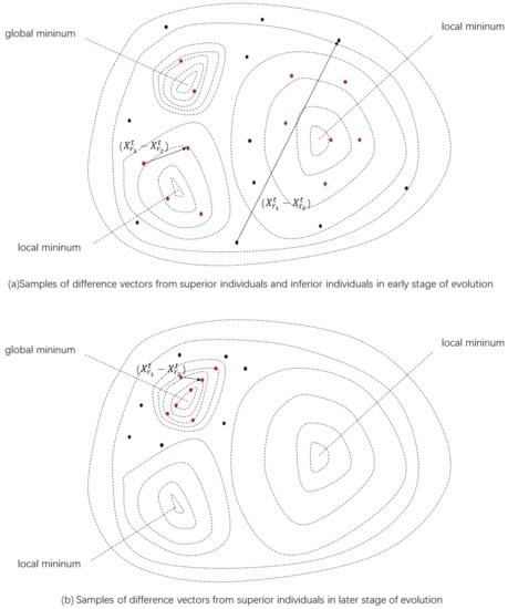 Figure 2a shows that in the early stage of the evolution, individuals in the solution space are uniformly scattered, and that inferior individuals are often far away from optimal regions. The distance between inferior individuals is often large, leading to the difference vector being relatively large, which is suitable for exploring solution spaces with a big step size. However, superior individuals may be located in different optimal regions, and the step size of the difference vector formed by them is relatively small, so it is suitable for local exploitation of each optimal region.