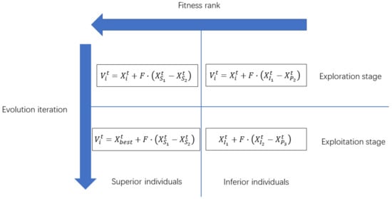 where . It can be seen that the difference vector of the superior population is only selected from itself, while that of the inferior population selects the starting vector from the whole population and the end vector from the inferior population.
