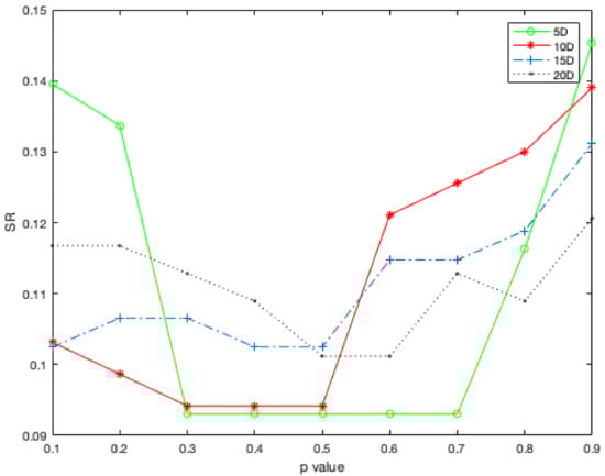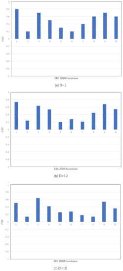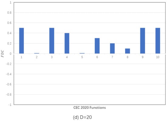 To more clearly show problem descriptions with FDC, we choose 10 optimization problems from CEC2020 [], whose corresponding FDC in 5, 10, 15, and 20 dimensions is calculated from Equations (12) and (13), as shown in Figure 4. The FDC value is generally high for a simple unimodal function like function 1, but low for a complex multimodal function. With the increase of dimension, the complexity of optimization problems increases, and the corresponding FDC decreases gradually.