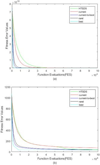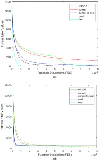 Although the characteristics of , , and have been described [], comparison with is rarely mentioned. Therefore, we compare the convergence rates of the four mutation strategies and the proposed HTSDS on typical optimization problems.