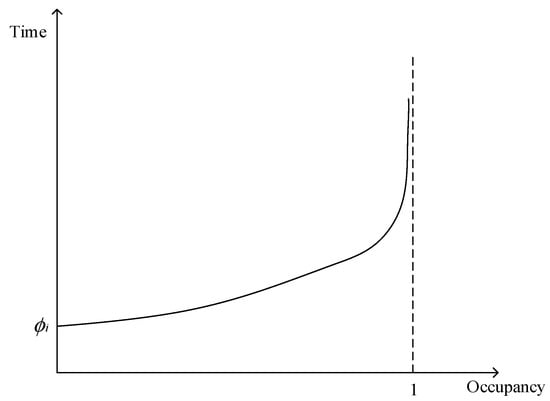 Usually, the cruise time of the vehicle is related to the current occupancy rate of the parking lot and the parking information obtained by the driver. In reality, the driver usually knows the number of free parking spaces in the parking lot, rather than the accurate information of free parking spaces, assuming that the cruise time of the vehicle in a parking lot depends only on the use of the parking lot and that the driver chooses the parking space randomly. The usual parking cruise time function is shown in Figure 1. When the parking occupancy is at a low level, the vehicle cruise time increases with the occupancy growth, but in general, the vehicle cruise time is relatively stable. When the parking occupancy exceeds a certain value, the vehicle cruise time increases rapidly. When the parking occupancy is close to 1, the vehicle cruise time gradually approaches infinity.