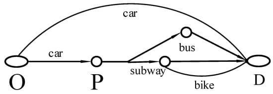 Park and ride network. O represents the origin of travel, P represents the parking lot, and D represents the destination of travel.