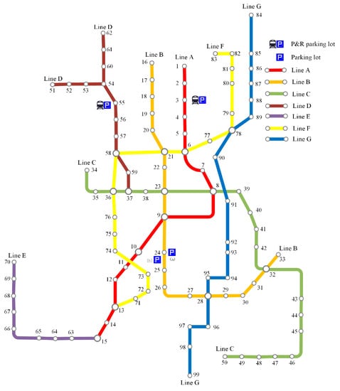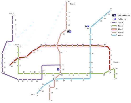 The experimental method was verified by selecting the Shenzhen rail transit network, which is similar to Shanghai’s rail transit network and has similar economic conditions. The following road network depicted in Figure 9 can be obtained by simplifying the Shenzhen rail transit network. The parameters of parking lot have been completed in Table 11. For the hypothetical road network experimental conditions, refer to Section 3.1.1.