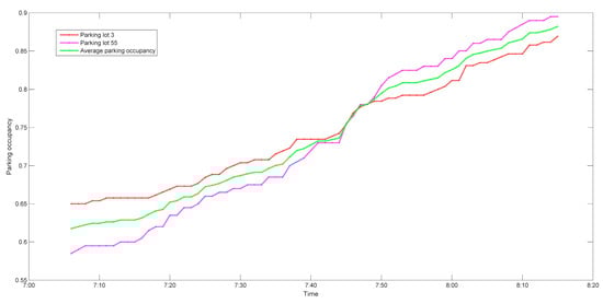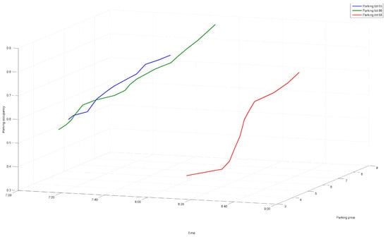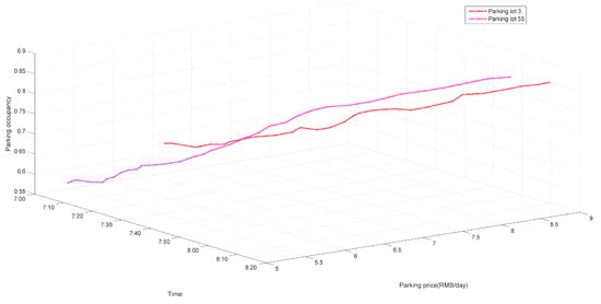 Since the traffic conditions and economic development level of Shenzhen are similar to that of Shanghai, according to the Formula (19) and the dynamic price adjustment method, the arrival of vehicles in each parking lot was obtained as shown in Figure 10, which indicated the time when the vehicle reached, the parking lot occupancy rate, and parking lot price at the corresponding time. Finally, the change of parking occupancy in each parking lot and parking guidance at different prices are shown in Table 12 and Table 13 respectively.