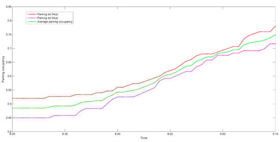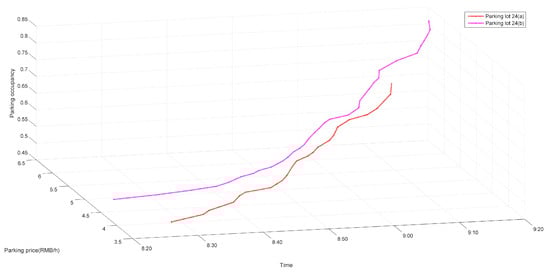 It can be seen from Table 7 that the price regulation gave the driver a parking with a low occupancy rate trend. After the application of the induction process, the parking lot with low occupancy rate had larger change rate because the capacity of the 24(b) parking lot was larger than that of the 24(a), so the change rate of the two parking occupancy rates was similar. For specific trends, refer to Figure 7 and Figure 8.