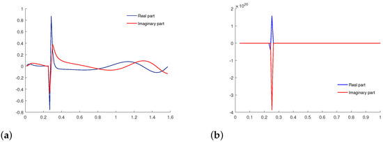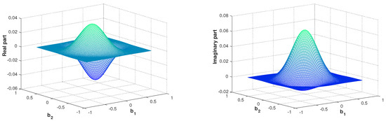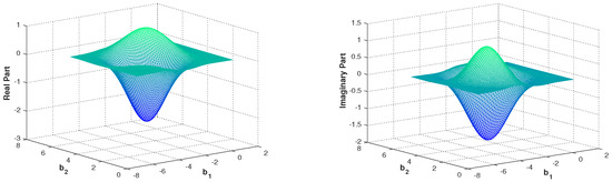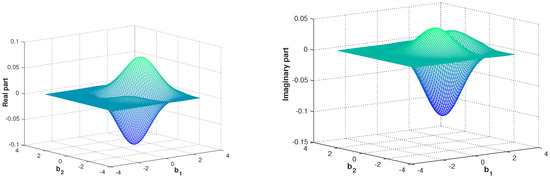 The non-separable linear canonical wavelet transforms shown in Equation (26) of f corresponding to are plotted in Figure 4, Figure 5 and Figure 6.