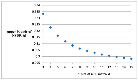 Evidently, the upper bound of is a function of n, i.e., the size of a PC matrix A. This property is important, because one of the reasons why Saaty’s consistency check is criticized is that it cannot provide proper critical values for matrices of different sizes [29]. Table 1 lists the upper bounds of for a PC matrix A of size from 3 to 15.