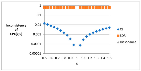 Trivially, the only possibility of this matrix to be consistent is when . By using a distance-based inconsistency reduction algorithm, Koczkodaj and Szwarc proclaimed that x > 1.5 is suspiciously high and the PC matrix needs to be re-examined [29]. In fact, by using the SDR, we find that a matrix CPC(x, n) even with a small value of x less than 1.5 would be inconsistent. Figure 4 shows the values of CI, SDR, and Dissonance of the CPC(x, 5). Here, we set x from 0.5 to 1.5 with an increment of 0.05.