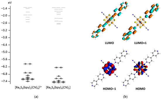 Electronic structures of trans-[Re6S8(bpy)2(CN)4]2− and trans-[Re6S8(bpy)4(CN)2] clusters in the near frontier region are characterized by the presence of the {Re6S8}-centered, almost degenerated HOMO and HOMO–1, lying at notable distances (close to 0.7 eV) from the underlying orbitals (Figure 5a). Two (for trans-[Re6S8(bpy)2(CN)4]2−) or four (for trans-[Re6S8(bpy)4(CN)2]) of the lowest unoccupied orbitals are localized mainly on the pairs of bpy ligands in the trans-positions (Figure 5b,c). HOMO–LUMO gaps (3.47 and 3.59 eV for [Re6S8(bpy)2(CN)4]2− and [Re6S8(bpy)4(CN)2], respectively) are comparable with those for {Re6Q8}2+-based clusters, with an inorganic apical ligand environment [40], and are much larger than those for [Re6Q8bpy4X2] (Q = S or Se; X = Cl or Br) clusters [12]. It is interesting to note that LUMOs for both new clusters show a significant contribution of Re d-orbitals (~15%) and have bonding characteristics in the Re–N direction. This fact contrasts with the electronic structures of [Re6Q8bpy4X2] clusters, which also contain LUMO–LUMO+3, localized mainly on the pairs of bpy ligands in the trans-positions, but with a negligible contribution of Re and Q atomic orbitals. Another interesting feature of the new cluster in comparison with [Re6Q8bpy4X2] molecules is the absence of a pronounced gap between the bpy-centered unoccupied orbitals and overlying orbitals. Potentially, this could cause the metal-to-ligand charge transfer (MLCT) weak-type emission of the new clusters in a similar way to that reported for cis- and trans-[Re6S8Cl4(bpy)2] anions [41].