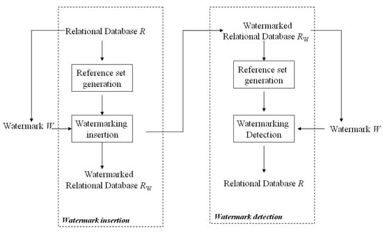 In this section, the details of the watermark insertion process of our proposed LRW-RDB scheme are given. Our proposed LRW-RDBhiding strategy, implemented in the watermark insertion algorithm, is based on the symmetry concept, which means the pattern of the hidden watermark should be random and the distribution of the hidden watermark remains uniform. The watermark insertion algorithm describes the process of embedding one watermark bit into the categorical attributes. The two reference sets