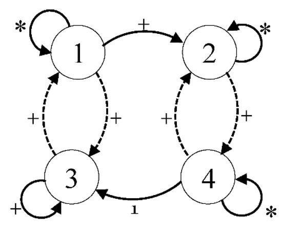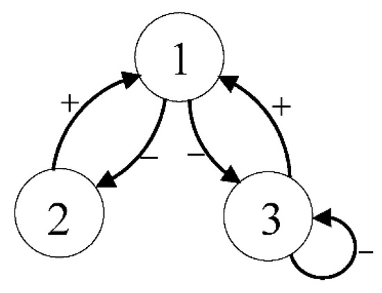 A certain matrix whose elements follow a sign pattern consists of the sign . The sign stability property of a matrix can be expressed if an arbitrary matrix follows the sign pattern similar to that of the original matrix and has a Hurwitz stability, regardless of the values of its elements [16,17]. The sign stability notion was first suggested in bionomics and utilized to assess the interactions between various large scaled ecosystem categories that cannot be defined by solid models and lofty sturdiness and various other types of uncertainties. The state–space matrix’s entity denoted by is represented by signs . While a positive sign is related to the class , which has a positive effect on the class . A negative effect is designated by a negative sign. No effect is denoted by zero. A visual description of the aforementioned situation could be provided by a directed graph, which is a graph reflecting the positive or negative relationship of the elements of the sign pattern matrix. For example, assuming that the corresponding sign pattern matrices, called directed graphs, are denoted by the following: