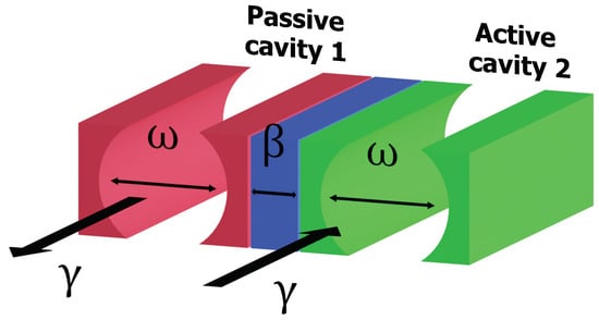In this paper, we analyze two quantum systems comprised of cavities forming a chain. The first model is a dimer that consists of only two cavities that linearly interact with each other. The first cavity (labeled by 1), which we call passive, loses the energy, whereas the second one (labeled by 2 and called active) gains the energy (see Figure 1). Such a system can be realized experimentally with an application of silica-on-silicon waveguide circuits [36], a telemetric sensor system [37], or two micro-resonators coupled by two fibers [26]. The effective Hamiltonian that describes our model can be represented as follows: