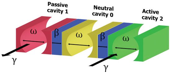 The second model that we shall discuss is an extension of the first one. That extension is realized by adding a third cavity (labeled here by 0) in the middle of the system, creating a three-mode model referred to as an optical trimer. That additional cavity is neutral, which means that it does not interact directly with the environment. The first and last cavities (labeled as previously, by 1 and 2) are still passive and active, respectively. Just for recollection, the passive cavity corresponds to the loss in energy, while the active one corresponds to the gain in energy. They do not directly interact with each other, but simultaneously interact with the neutral one (see Figure 2). The effective Hamiltonian describing our trimer can be written as follows:
