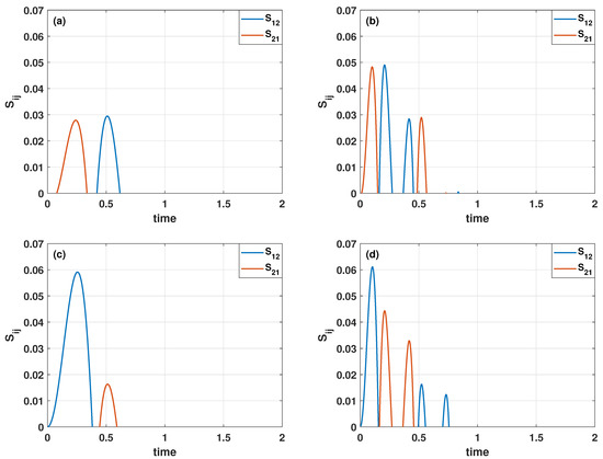 When we move away from the exceptional point, as the value of the coupling strength increases to (see Figure 3b), and perform the same analysis, the results become different from those presented in Figure 3a. At the beginning of the system’s evolution, the sequence of steering direction is the same as in the previous case. However, there are some differences if we compare both situations. First, steering starts to become positive just at the beginning of evolution (the notation means that subsystem i steers j). Moreover, the maxima of and are almost equal to each other, but are greater than those in Figure 3a. Third, the time when the redirection effect appears is shorter than for . Finally, after vanishing the steering in two directions, we can see that both steerings reappear again. Contrary to their first occurrence, steering appears as the first one.
