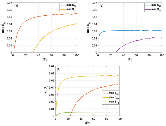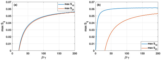 In Figure 4, we show the dependence of the maximal values of the steering parameters as a function of the . We consider two situations. For the first one, the passive cavity is excited at , while the active one is in a vacuum state (Figure 4a). We can easily see that for small values of , the maximal values of both and take negative values, and thus, no steering is generated. When , the steering starts to appear in both directions and . As increases, the maximal values of and rapidly grow and then stabilize at ≈0.06. Further growth of the ratio does not affect the maximal values of and significantly. Moreover, within the range of values of in which the steering effect occurs, the maximal values of and are approximately the same.
