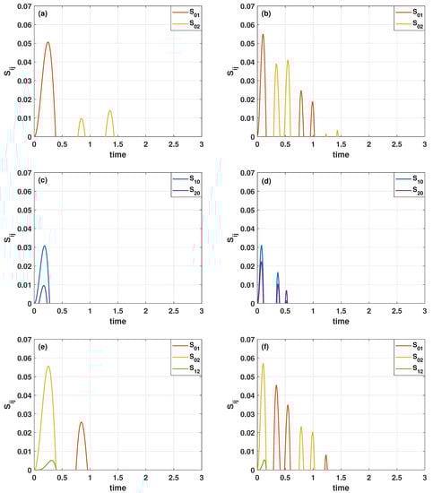 When the initial state of the system is (the middle, neutral cavity is initially excited), only the neutral cavity can steer the passive and the active ones—see Figure 5c,d. It differentiates the behavior of the steering appearing here from those depicted in Figure 5a,b. The evolution of steering parameters and takes the form of two and three subsequent peaks, similar to the previously considered situations. Moreover, the pair of parameters and reach their maxima simultaneously in the same instance of time. Nevertheless, when , the steering appears before —visually the peak corresponding to the parameter is more extended in time. Finally, after a single appearance of the two peaks, the system goes to an unsteerable state. When , the situation is similar to that depicted in Figure 5c. However, here, we observe the sequence of three, decreasing in their heights, pairs of peaks instead of the single pair.