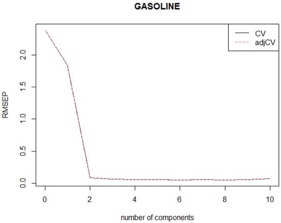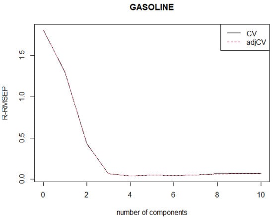 Leave one out cross validation of R-RMSEP and classical RMSEP for Gasoline data.
