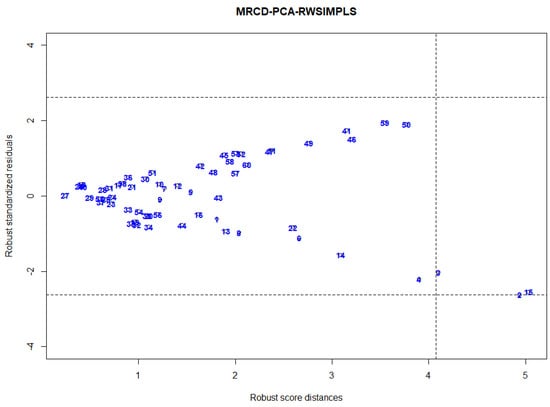 A diagnostic plot is very useful for practitioners to quickly capture abnormalities in data. Rousseeuw and Zomeren [] established a diagnostic plot to classify observations into four types of data points, namely regular observations, good leverage points, vertical outliers, and bad leverage points. The proposed plot plots the standardized residual versus squared robust Mahalanobis distance based on minimum volume ellipsoid (MVE) or minimum covariance determinant (MCD). In PLS regression analysis, orthogonal, score, and residual distance can be used to measure the degree of outlyingness of an observation []. Aylin and Agostinelli [] proposed a diagnostic plot to classify observations into four types of data points by plotting RWSIMPLS standardized residuals versus leverage values, i.e., the diagonal elements of the hat matrix that is used to identify HLPs. Any observation that corresponds to a leverage value larger than the cut-off points, 2p/n, is considered as HLPs. The disadvantage of this plot is that it employs leverage values that are proven to not be very successful in detecting multiple HLPs due to the masking effect []. Hence, using leverage values as diagnostic measure for identifying HLPs will produce unsatisfactory results. Thus, we propose a new diagnostic plot by plotting the MRCD-PCA-RWSIMPLS standardized residual against the robust Mahalanobis distance as in Equation (29) and cut-off point as in Equation (30).