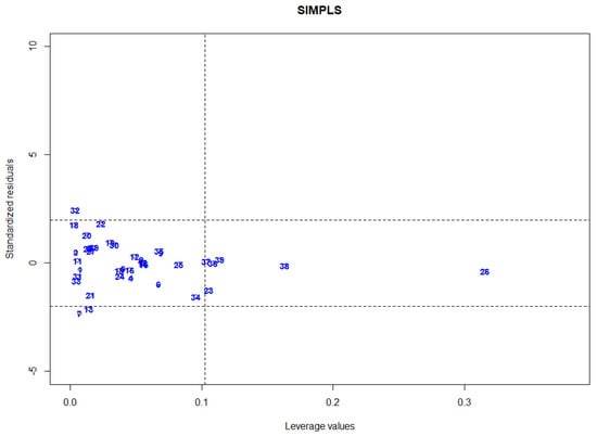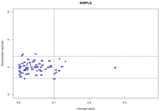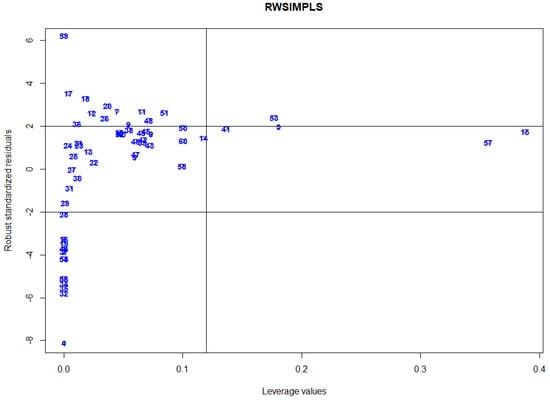However, it is now evident that PLS is not robust in the sense that its estimate is easily affected by outliers. In regression, outliers can be categorized into vertical outliers, residual outliers, and high leverage points (HLPs) or simply called leverage points []. Vertical outliers are outlying observations in the -space, while residual outliers are observations that have large residuals. HLPs are the outlying observations in the -space. It has the most detrimental effect on the computed values of various estimates, which results in incorrect statistical model development and instills impacts on decision making. Therefore, accurate HLPs detection using reliable methods is vital. In general, classical approaches typically fail to correctly identify outliers in the dataset. As a result, the estimated model will be affected by the masking and swamping problems. ‘Masking’ refers to a situation where outliers are incorrectly declared as inliers, while ‘swamping’ refers to normal observations incorrectly declared as outliers.