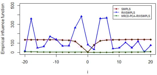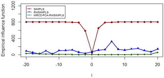 In order to compute the empirical influence function for Octane data, we first removed the six outliers for observations 25, 26, 36, 37, 38, and 39 from the dataset in order to avoid distracting errors in the influence function computation. Data are then contaminated in the same manner as that of [] by simultaneously replacing the first explanatory variable and the first dependent variable with values ranging from −20 to 20. The empirical influence function is calculated as in Equation (39). Figure 12 displays the graphical result of empirical influence functions for SIMPLS, RWSIMPLS, and our proposed MRCD-PCA-RWSIMPLS method. We observe that the empirical influence function for the SIMPLS is affected when we replaced the first value of the response and the explanatory variables with 0. It can be observed that SIMPLS has the large empirical influence values and its plot plunges at = 0 and = 0 and provides a small value of influence function at that point. The performance of RWSIMPLS is terrible as it fluctuates tremendously when the data are corrupted. It shows that RWSIMPLS is extremely vulnerable to even a single outlier in the data. It is interesting to observe that MRCD-PCA-RWSIMPLS has the lowest empirical influence values and shows no fluctuation in its estimates.