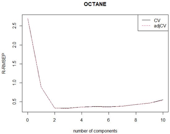 The second real example in this paper is the octane dataset where it contains near-infrared (NIR) and absorbance spectra over p = 226 wavelengths with n = 39 gasoline samples. Leave one out cross validation (LOOCV) is performed to determine the optimal number of components, SIMPLS for k = 1, 2, 3, …, 10 components, and the scree plot is obtained. The robust root mean squares error predicted (R-RMSEP) is computed. We first divide the dataset into train and test datasets. For octane data, we take and with 10 components. From the scree plot in Figure 7, it can be observed in the R-RMSEP plot that there is a substantial drop from component one to component two, and after component two, the graph line shows no major changes. Moreover, in Table 5, the R-RMSEP produces a smaller root mean square error of 0.576 compared to classical RMSEP. In Table 6, the two components of R-RMSEP explained almost 80 percent of the total variance in Octane data. Therefore, it is adequate to choose the number of components as equals to two for the Octane dataset. On the contrary, the classical RMSEP in Figure 8 shows the lowest point in the graph is on the third component, and there is a fluctuation in the line. It indicates that the classical RMSEP is intruded by the outliers in the Octane dataset. Based on Table 4, the third component of classical RMSEP produces very high variance explained at 99.06 percent, which is almost 100 percent of data explained, and this can cause overfitting as the classical RMSEP is influenced by outliers [].