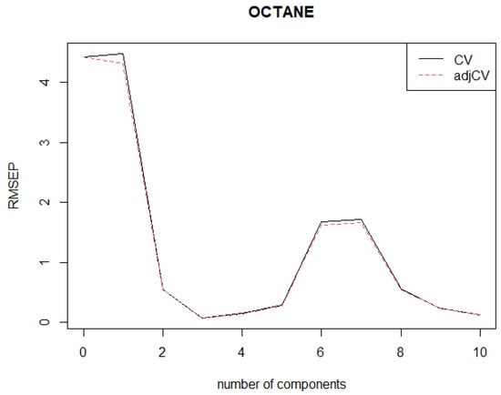 Leave one out cross validation for R-RMSEP and classical RMSEP for Octane data.