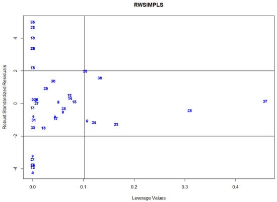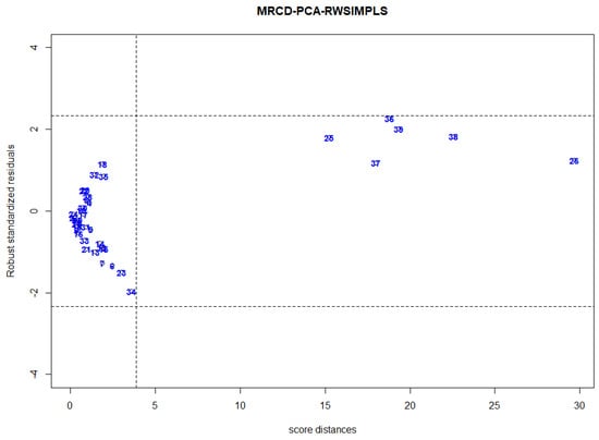 We also illustrate our proposed diagnostic plot on this dataset to classify outlying observations and to compare the robustness of our proposed algorithm, MRCD-PCA-RSIMPLS, and the other two methods, RWSIMPLS and classical SIMPLS. The authors of [,] used this dataset to identify outliers, and they diagnosed six outliers in X-space. The outliers are the observations that contain added ethanol. From Figure 9, it is clearly shown that MRCD-PCA-RSIMPLS successfully detects the true six high leverage points (Cases 25, 26, 36, 37, 38, and 39). On the other hand, in Figure 10, the RWSIMPLS method suffers from swamping and masking problems as it detects good observations as outliers, and it fails to detect real outliers. RWSIMPLS declares observations 6, 23, 25, 34, 37, 38 and 39 as good HLPs, vertical outliers for observations 4, 7, 10, 13, 16, 18, 20, 21, 22, 24, 26, 32, and 36. The classical SIMPLS also suffers from masking and swamping effects. As observed, the SIMPLS in Figure 11 identifies observations 23, 26, 36, 37, 38, and 39 as good HLPs and observation 7, 13, and 32 as vertical outliers. SIMPLS suffers from a masking problem as it fails to detect the outlier point on observation 25. MRCD-PCA-RWSIMPLS diagnostic plots are very efficient in detecting and classifying outliers without the masking and swamping problem. However, RWSIMPLS could detect the outlying observation correctly with additional false outliers, whereas the performance of the SIMPLS is even worse. The method fails to detect the true HLPs.