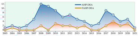 Distribution of the AHP-DEA and FAHP-DEA publications (2003–2021).
