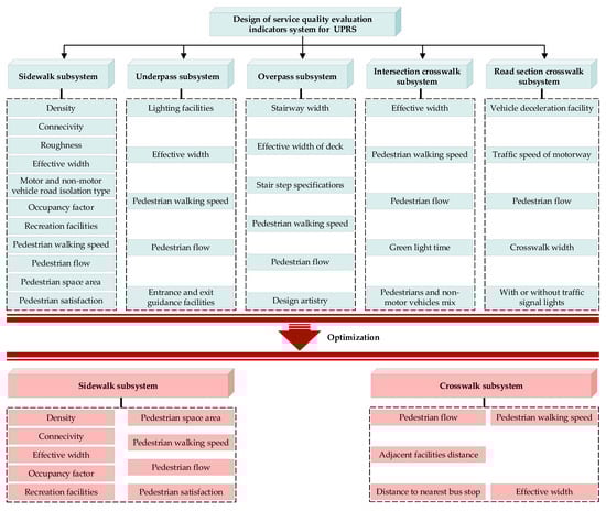 The key to constructing the urban pedestrian traffic indicator system is to select reasonable evaluation indicators and analyze their relationship. In this work, the UPRS was divided into five subsystems of sidewalks, overpass, underpass, intersection, and road section to complete the preliminary selection. Then, a set of subjective and objective comprehensive evaluation systems was established from the two aspects of the quantitative and qualitative analysis. Furthermore, the primary data of pedestrian satisfaction was obtained through questionnaire surveys, and the appropriate methods integrated with subjective and objective was selected to evaluate the UPRS comprehensively. The evaluation indicators selected should be preliminarily streamlined using reasonable screening methods during the optimizing process. One-sided inspection and overall inspection were carried out after the indicators with inclusive relationships were eliminated. Combined with the urban pedestrian traffic in China, the indicators were refined concerning the relevant regulations. Considering the characteristics of UPRS, the indicators were divided into two types of crosswalk facilities and sidewalk facilities. Overpasses, underpasses, road crosswalks, and intersections of crosswalks belong to crossing roads, and sidewalks are non-crossing roads. Finally, the evaluation indicator system was established from two aspects of sidewalk and crosswalk facilities, as shown in Figure 2.