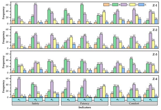 Five satisfaction levels are set for each indicator of strongly satisfied, fairly satisfied, neutral, fairly dissatisfied, and strongly dissatisfied, represented by A, B, C, D, and E, respectively. Each survey region was assigned 100 questionnaires in this research, and 89, 90, 87, and 83 valid questionnaires were received from Z-1, Z-2, Z-3, and Z-4. To facilitate statistical analysis, we further added questionnaires, and the final beneficial questionnaires in each area reached 100. After sorting out, the frequency distribution of satisfaction selection in the four survey areas was captured, as shown in Figure 5.