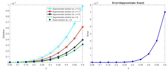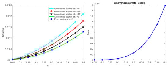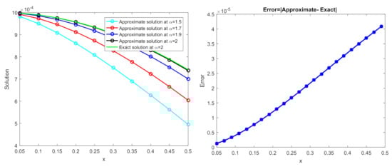 The left side figure shows the comparison of AHPM solution and exact solution of Example 2 for different values of and x at . The right side figure shows the absolute error of AHPM solution and exact solution of Example 2 for different values of x and at .