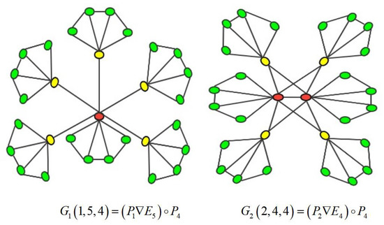 is composed of one center node, k branchings, and paths of length n. is composed of two center nodes, branchings, and paths of length n. Its connection relationships are shown in Figure 1. The red nodes represent the central nodes, the yellow nodes represent the branchings nodes, the green nodes represent the nodes of the paths, and the black solid lines represent the interlayer connection relationships between the nodes.