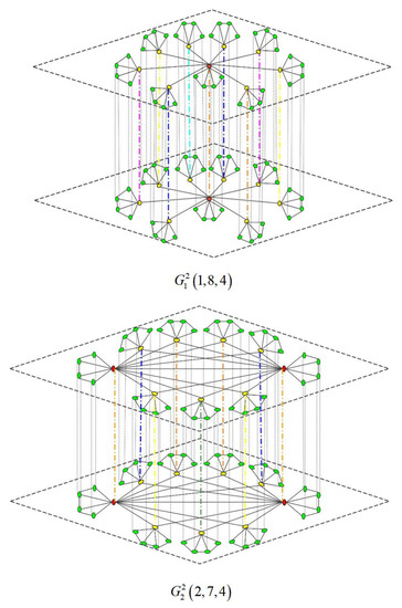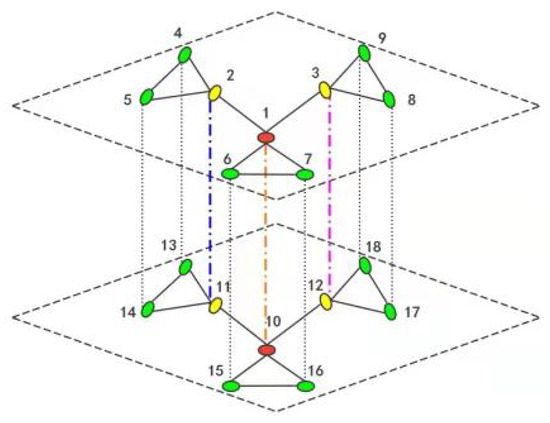 and are composed of Q layers and , respectively. The total number of nodes is , and the connection relationships are shown in Figure 2. The colored dotted lines represent the connection relationships between each layer.