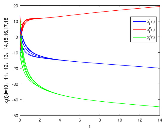 where is the state of a node, represents the inherent nonlinear dynamics of the node, , ; represents the intralayer connection, and the connection weight is 1. denotes the interlayer connection, and the connection weight is . The initial value of the system is randomly selected. Through the simulation, the state trajectory of the system is shown in Figure 4 and Figure 5. It can be seen that the state trajectory of nodes achieves synchronization under the coupling effect.