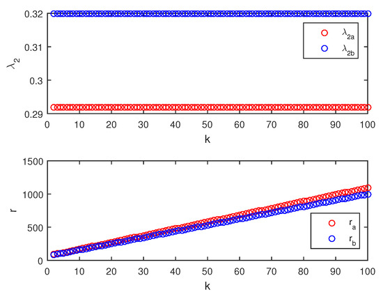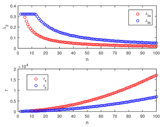 The eigenvalues of a square matrix A are the roots of its characteristic polynomial , . The eigenvalues of matrices have many applications [8,33]. In this paper, the eigenvalues of the supra-Laplacian matrix H are used to study the synchronizability of the networks. The eigenvalues of the supra-Laplacian matrix H are . is obtained from the properties of the supra-Laplacian matrix. According to the MSF, when the synchronized region is unbounded, the larger the is, the stronger the synchronizability of the network is; when the synchronized region is bounded, the smaller the is, the stronger the synchronizability of the network is [29].