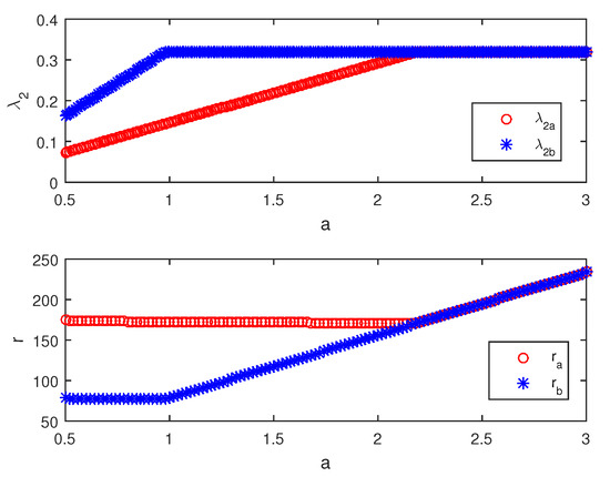 In the following analysis, in order to distinguish the synchronizability indexes of multi-layer-coupled star-composed networks, when the synchronized region is unbounded, we use and to represent the synchronizability indexes of and . When the synchronized region is bounded, the synchronizability indexes of and are represented by and , respectively.