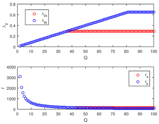 Figure 10. and r change with Q. - When the synchronized region is bounded, we set , with the increase in k as in Figure 6. monotonically increases from 91.2508 to 1094.7 and monotonically increases from 83.2082 to 998.1725. When k is the minimum, the synchronizability is the maximum. We set . With the increase in n in Figure 7, rapidly increases from 127.0276 to 17141 and rapidly increases from 127.0276 to 6922.5. When n is the minimum, the synchronizability is the maximum. We set . With the increase in a in Figure 8, decreases slowly from 174.5482 to 171.1677 and then increases rapidly to 233.7460, while decreases slowly from 78.1736 to 77.2113 and then increases rapidly to 233.7460. The synchronizability of and reaches the maximum at and , respectively. We set . With the increase in d in Figure 9, decreases rapidly from 1242.3 to 171.2582 and then increases monotonically to 581.4077, while decreases slowly from 1242.3 to 77.2526 and then increases rapidly to 260.3906. The synchronizability of and reaches the maximum at and , respectively. We set . With the increase in Q in Figure 10, rapidly decreases from 3104.3 to 171.1760 and then slowly increases to 172.9032, while decreases rapidly from 3104.3 to 77.2158 and then increases slowly to 77.4368. The synchronizability of and reaches the maximum at and , respectively.