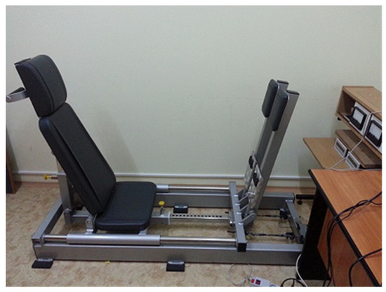 Initially, the maximum isometric voluntary contraction (MIVC) was measured for each leg. Subjects assumed the position by resting their backs against the seat backrest. The tested leg was placed on a dedicated pad attached to the board, while the untested leg rested on the ground. The knee joint was flexed to an angle of 60°. The correct angle was obtained by moving the seat linearly and was checked using an electronic goniometer attached with Velcro to the legs. The arms of the goniometer were attached to the thigh and shank in such a way that the axis of rotation of the goniometer coincided with the axis of rotation of the knee joint in the sagittal plane. Three MIVCs of 3 s duration were carried out by each leg in random order. The rest period between testing the dominant and non-dominant leg was 30 s. The mean force value for each trial was calculated and then the highest score from the three trials was used to determine the target force (50% MIVC) that subjects were expected to reproduce.